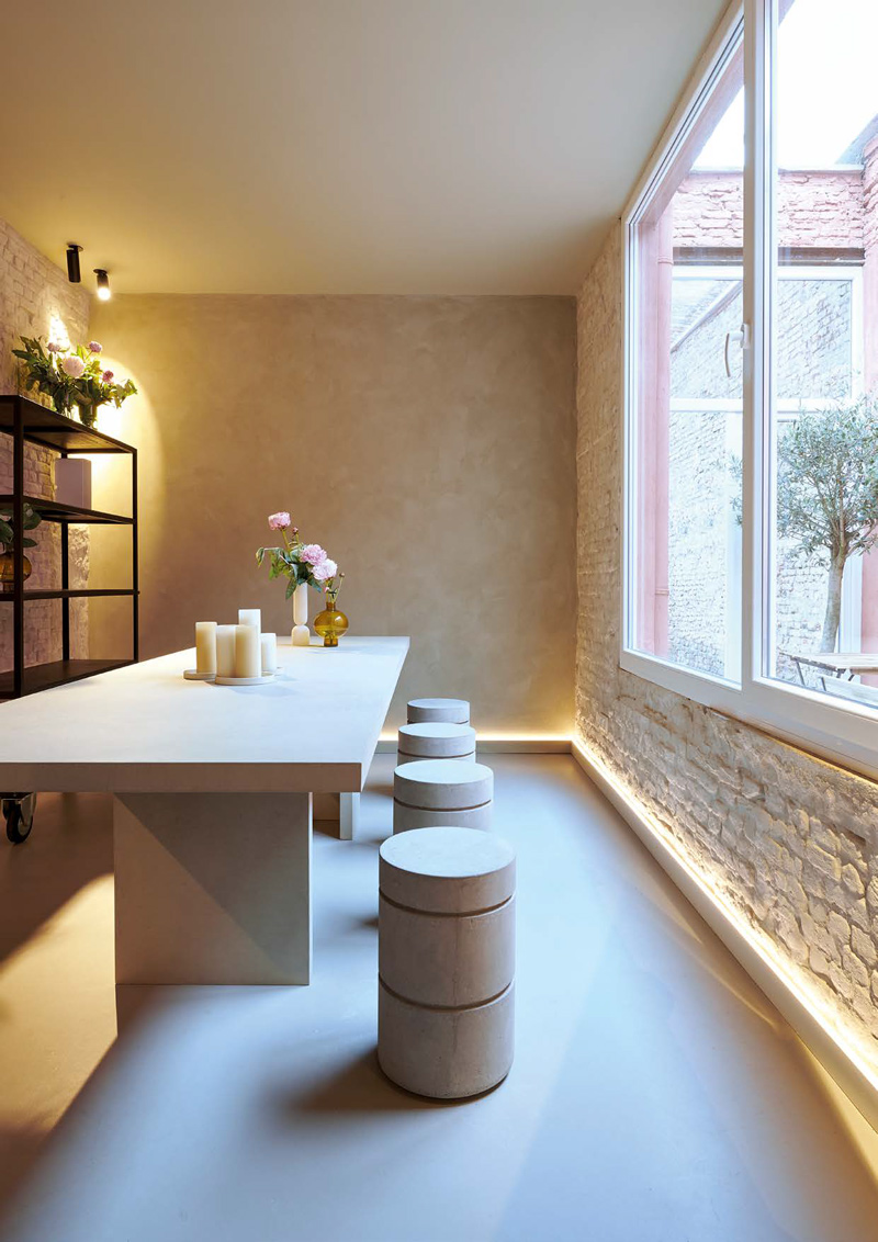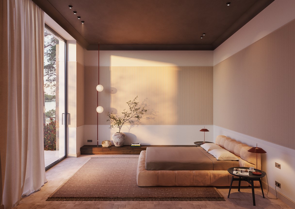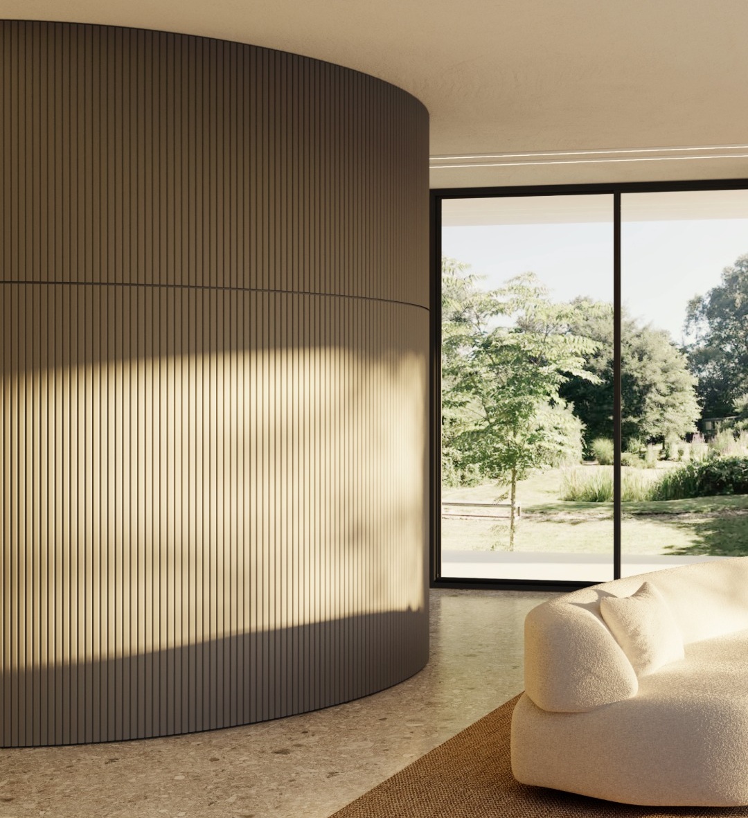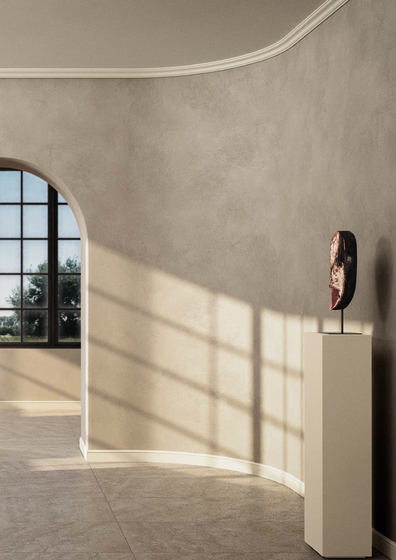 Delikatne, organiczne profile listew czy paneli ściennych mogą podkreślać naturalne rytmy wnętrza. Idealnie sprawdzą się tu panele z nowe kolekcji „The Essence of Rhythm”, których struktury inspirowane były naturą: BOHEMIA, ALLEGRETTO, CALANDO i CANELE XL. Sztukateria pomalowana w kolorach ziemi — piasku, gliny, ciepłej szarości — stanowi neutralną oprawę dla roślinności. Można nią obramować wnęki z zielenią, tworząc wrażenie „ogrodu w ramie”.